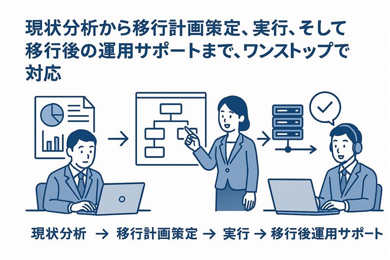 このプロセスには、現状調査、移行計画策定、再開発、ユーザー教育まで高度な専門知識が不可欠です。