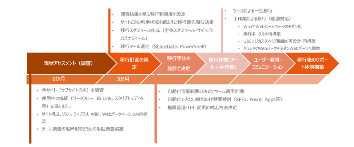 オンプレミスの SharePoint Serverやファイルサーバー、Notesなど様々なシステムからSharePoint Onlineへの移行を支援いたします。ShareGate DesktopやAvePoint FLYといった移行ツールを使った移行だけでなく、移行ツールにはできない移行要件もPowerShellスクリプトなどの開を行い、お客様のニーズにお応えいたします。